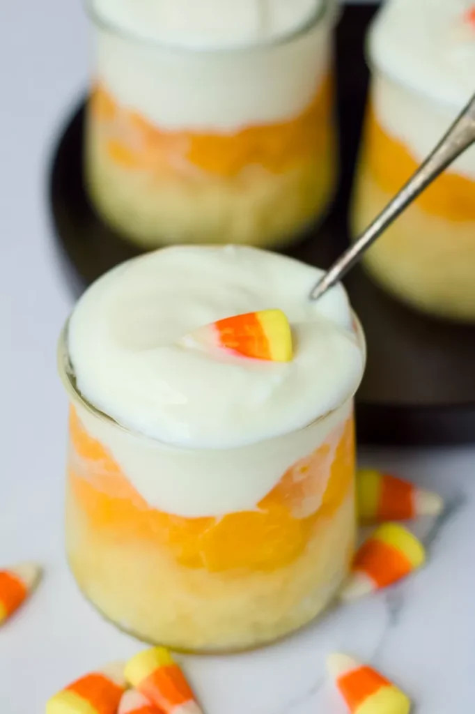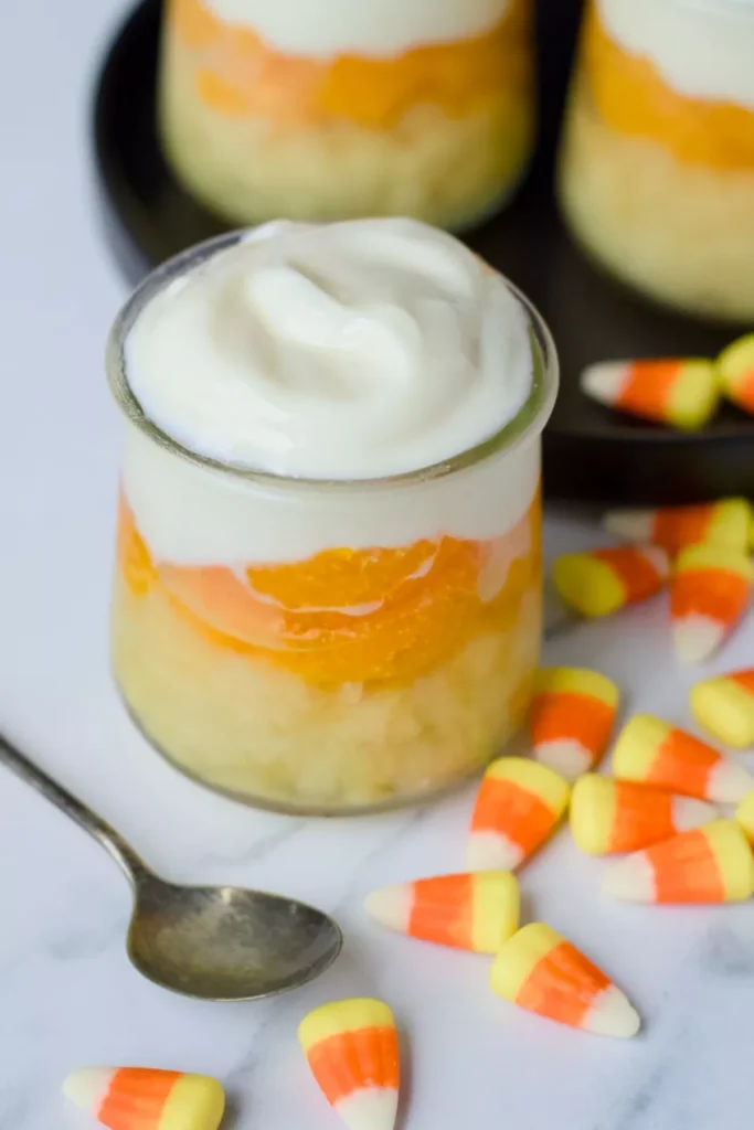- Top with yogurt – Finish with a thick layer of the vanilla-honey Greek yogurt on top to mimic the white tip of candy corn.