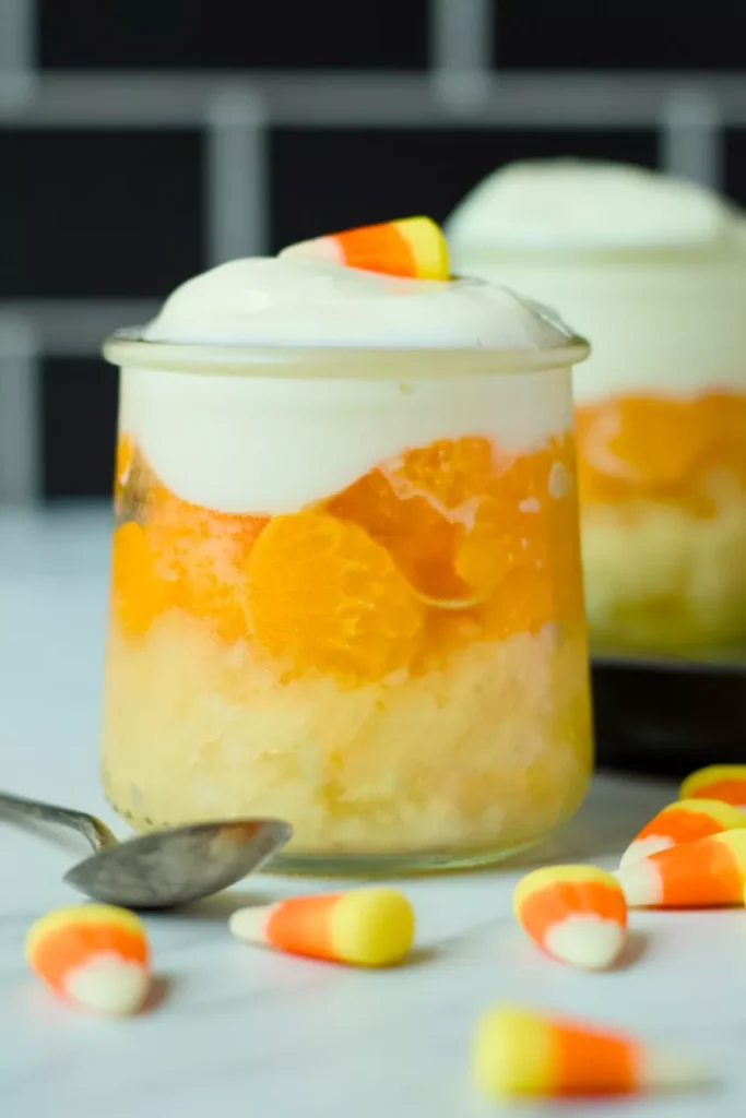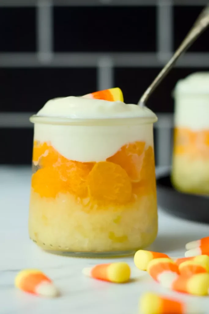 - Layer the pineapple – Add a generous layer of crushed pineapple to the bottom of clear glasses or cups. This creates the yellow “candy corn” layer.