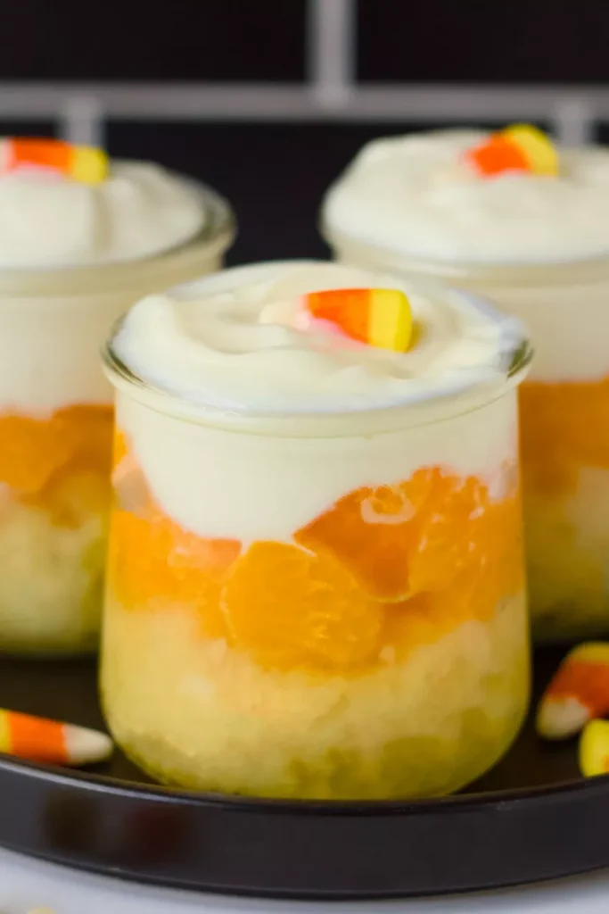 Inspired by the classic candy corn colors, each clear glass shows off bright yellow crushed pineapple, vibrant orange mandarin slices, and a naturally sweetened layer of thick creamy Greek yogurt on top.