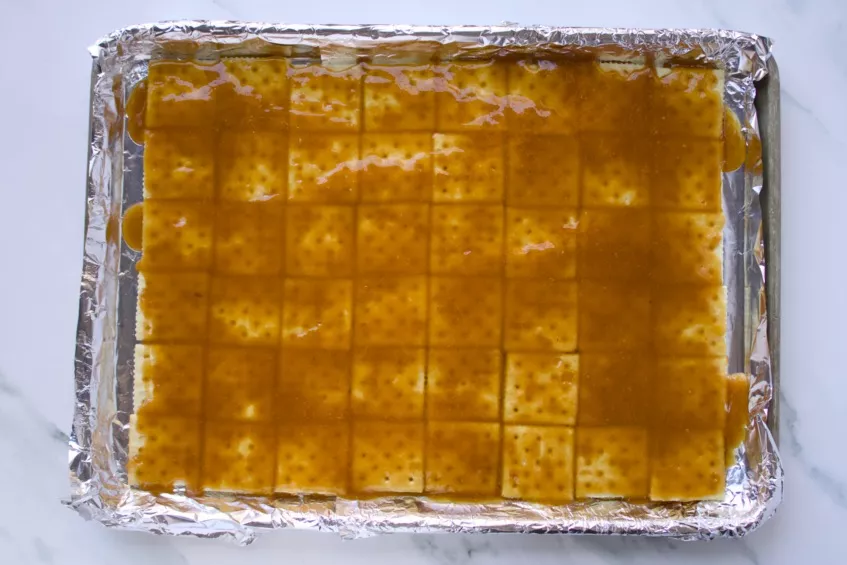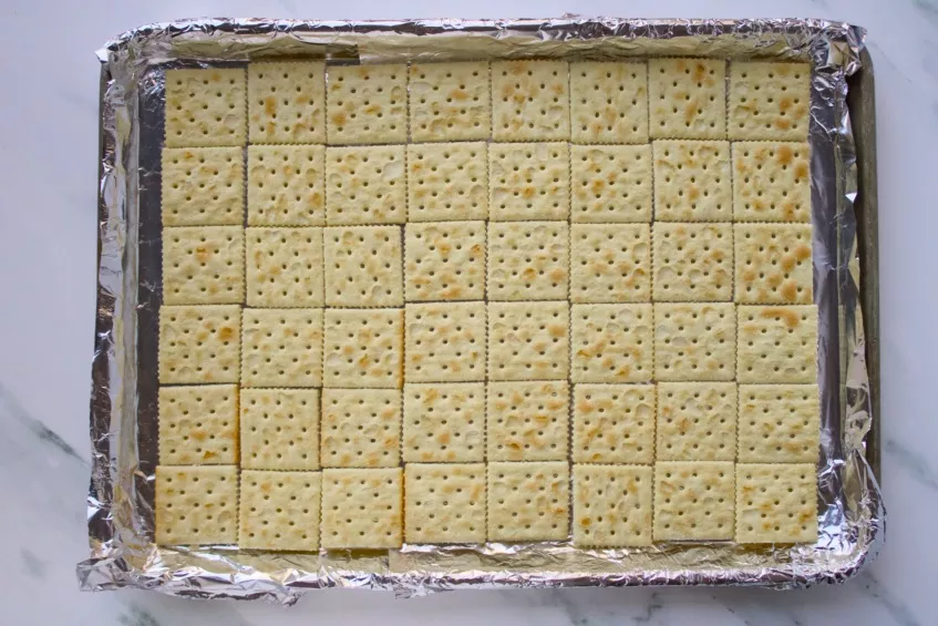 - Arrange saltines in rows in a single layer to cover the pan. An 8×6 formation fit perfectly in a standard cookie sheet.