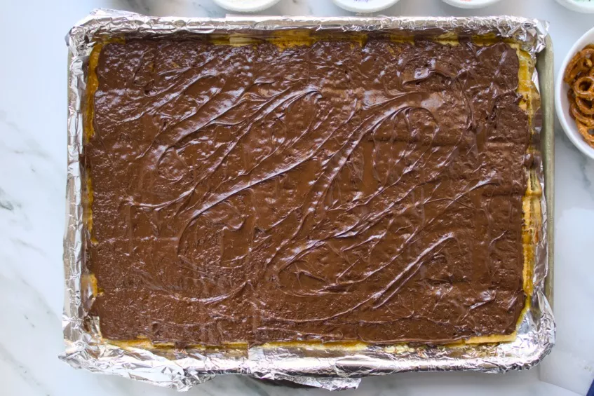 - Immediately pour the hot toffee mixture over the saltine layer. Carefully spread it evenly over the crackers with a rubber spatula.
