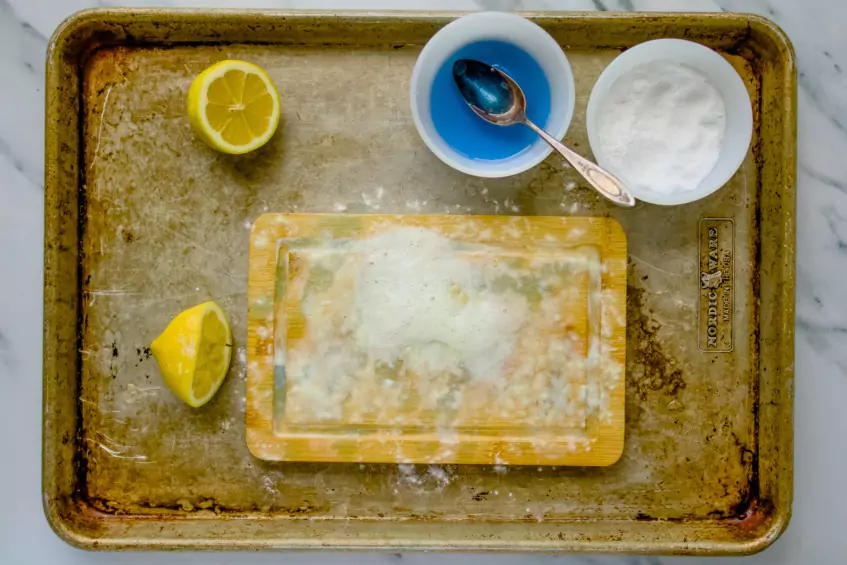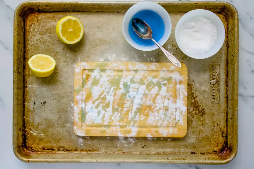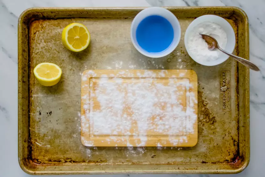 - Lemon or vinegar – Both are acidic, which reacts with the baking soda and helps break down lingering smells and disinfect the board.